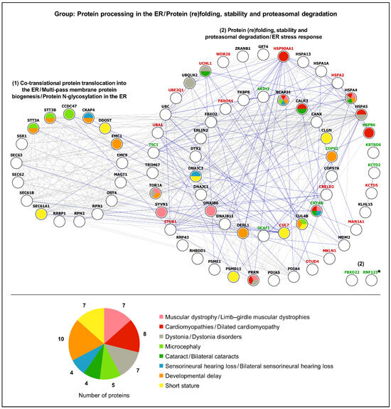 PPI and gene–disease association network of ‘Protein processing in the ER/Protein (re)folding, stability and proteasomal degradation’ functional protein group. The network comprises differentially expressed proteins found in LAP1 E482A fibroblasts [32] as well as LAP1-interacting proteins (identified by gene name). The PPI data were retrieved from the STRING database [34] and the PPI network was constructed using the Cytoscape software [36]. Nodes with a black label represent LAP1-interacting proteins, while nodes with a green or red label symbolize, respectively, upregulated or downregulated proteins (the black asterisk following the name indicates deregulated proteins that are LAP1 interactors). Blue edges denote physical/functional associations between LAP1-interacting proteins and LAP1 E482A fibroblasts’ differentially expressed proteins, whereas grey edges correspond to associations between proteins of the same proteomic dataset. The gene–disease association data were retrieved from the DisGeNET online platform [37]. The different colors filling the nodes’ interior represent specific diseases/pathological phenotypes (as indicated in the figure) associated to the proteins. The total number of proteins with known associations to each LAP1-related disease/pathological phenotype is also shown. ER, endoplasmic reticulum; LAP1, lamina-associated polypeptide 1; PPI, protein–protein interaction.