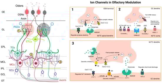 The initial transformation of odor signals occurred at the synaptic glomeruli. Ion channels, including Nav1.7, Cav2.1, and Cav2.2, are localized to the presynaptic terminals of OSNs and serve as “switches” for neurotransmitter release in response to olfactory stimuli. Similarly, the lateral dendrites of M/TCs exhibit a rapid neurotransmitter release facilitated by Cav2.1 and Cav2.2, which activates a network of GABAergic interneurons, initiating olfactory modulation. The shared characteristics of Cav2.1 and Cav2.2 at the presynaptic terminals of OSNs and M/TCs suggest a potential consistency in channel distribution and function among projection neurons in the OB. This is likely influenced by chemotactic factors and their differential expression during development [89].