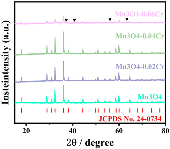 Figure 1 shows the XRD patterns of Mn3O4 synthesized under different Cr doping conditions. As indicated by the figure, the diffraction peaks of all four samples correspond well with those of Mn3O4, indicating that the main phase of the four precursor samples is Mn3O4. The samples Mn3O4, Mn3O4-0.02Cr, and Mn3O4-0.04Cr exhibit sharp diffraction peaks and narrow half-peak widths, signifying high crystallinity in these three samples. In contrast, the sample Mn3O4-0.06Cr has relatively lower diffraction peaks compared to other samples, indicating lower crystallinity. Additionally, there are minor impurity peaks (marked with ♥) present in Mn3O4-0.06Cr, which are attributed to chromium oxides. These findings suggest that during the preparation of Mn3O4-0.06Cr, excessive Cr addition led to some Cr not being properly doped into Mn3O4, resulting in the precipitation of Cr oxides and affecting the crystallization nucleation of Mn3O4.