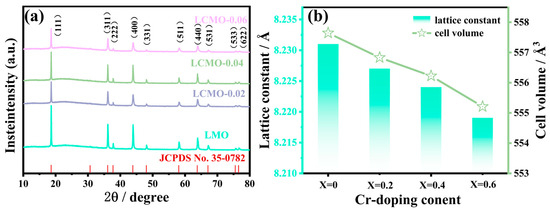 XRD analysis, a rapid and non-destructive technique, was employed to characterize the four samples. As illustrated in Figure 2a, the XRD patterns of all samples corresponded well with the standard card for lithium manganese oxide, exhibiting no significant impurity peaks. This correspondence indicates that the primary component is LiMn2O4 with an Fd-3m cubic spinel structure, underscoring that the substitution of Cr3+ for Mn sites does not alter the spinel structure of LiMn2O4 [10,31]. A closer examination reveals that the peaks of the LMO sample were sharper and more intense compared to those of the doped samples, suggesting a decrease in crystallinity with Cr3+ doping. Among the doped samples, LCMO-0.04 exhibited the strongest peak intensity, indicating superior crystallinity. After refining the XRD patterns of the samples, the lattice parameters were determined as 8.231, 8.227, 8.224, and 8.219 Å, respectively, demonstrating a decreasing trend with increasing doping levels. This decrease suggests that the substitution of Cr3+ induces some degree of lattice contraction. This phenomenon can be attributed to the reduction in the content of Mn3+ with a high ionic radius of 0.072 nm and a corresponding increase in the content of Mn4+ with a smaller ionic radius of 0.067 nm, leading to a reduction in the overall lattice parameter [32].