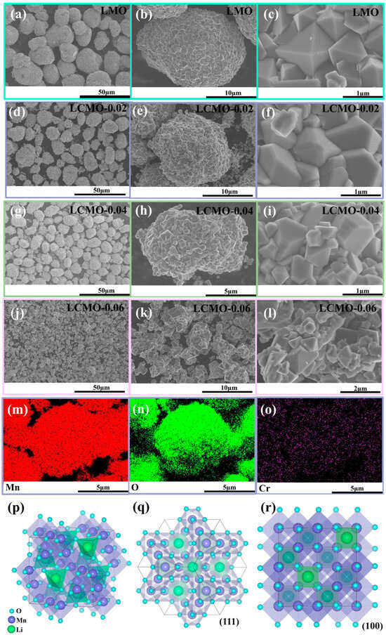 (a–c), (d–f), (g–i), and (j–l) SEM images of LMO, LCMO-0.02, LCMO-0.04, and LCMO-0.06. (m–o) EDS images of LCMO-0.04. (p–r) Schematic diagrams showing the arrangement of LiMn2O4 with different crystal plane orientations.