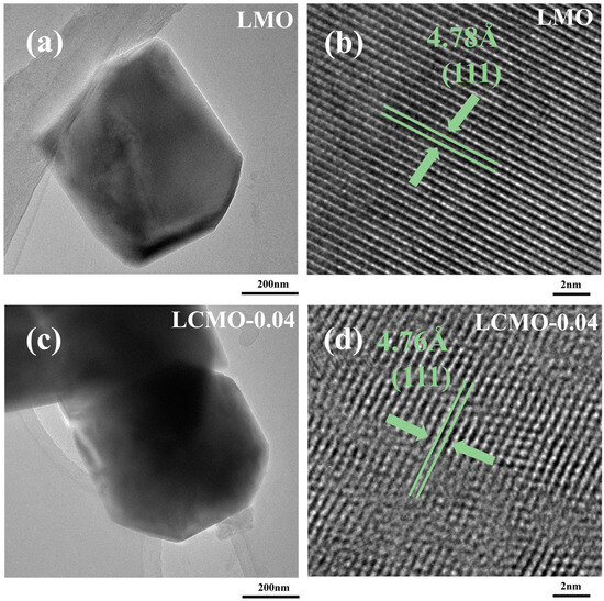 TEM and HRTEM techniques have been employed to provide an in-depth observation of the crystalline structure and surface morphology of the samples. Figure 4a,c show that the single crystal grain sizes of both samples are quite similar, approximately around 800 nm. Notably, the LMO sample displays a spinel-type morphology, whereas the LCMO-0.04 sample exhibits a truncated octahedral morphology.