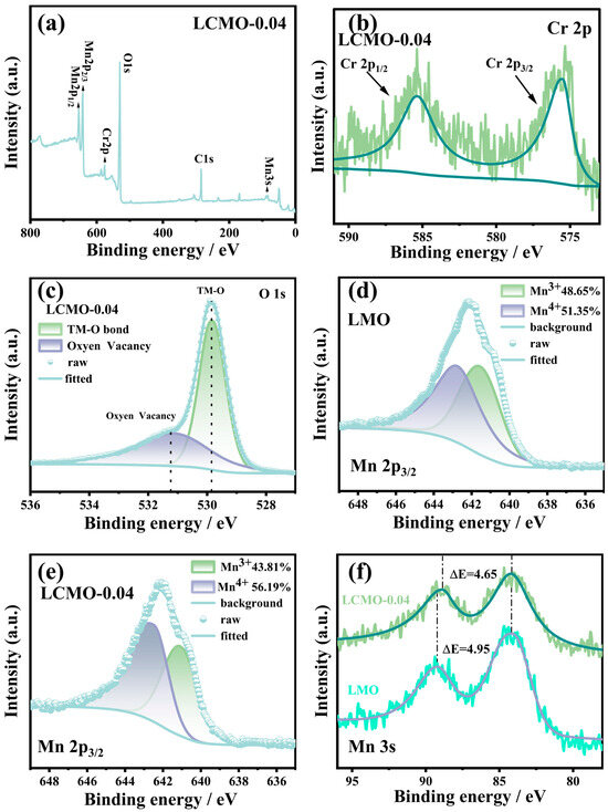 (a) XPS full spectrum of the LCMO-0.04 sample. (b) Fitted spectra of of Cr 2p inLCMO-0.04 samples. (c) Fitted spectra of of O 1s in LCMO-0.04 samples. (d,e) Fitted fine spectra of Mn 2p3/2 for LMO and LCMO-0.04. (f) Fitted spectra of Mn 3s for LMO and LCMO-0.04.