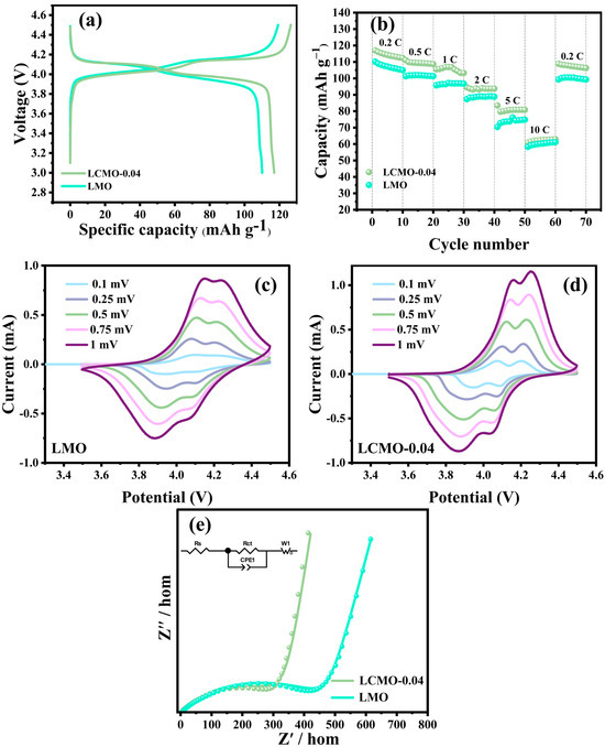 Figure 6c,d present the CV curves at various scan rates ranging from 0.1 to 1 mV/s. With the increase in scan rate, the voltage gap between the oxidation and reduction peaks gradually widens, indicating an enhanced level of electrochemical polarization. Moreover, the sharpness of the CV peaks reflects a quicker insertion/extraction rate of Li+ within the material, as well as enhanced electrochemical activity during charge and discharge [4,32]. By comparing the oxidation and reduction peaks, it is evident that the peaks of the LCMO-0.04 sample are sharper than those of the LMO sample, suggesting better electrochemical reversibility for LCMO-0.04. This phenomenon can be attributed to the smaller particle size of the LCMO-0.04 sample, which provides a larger electrochemical active surface area and thus enables a faster initial electrochemical activation process.
