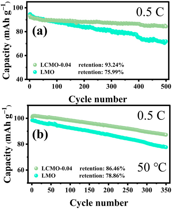 It is possible to improve the electrochemical performance of LiMn2O4, particularly via metal cation doping, which is recognized as an effective method. Common cation dopants include Co2+ [22], Fe3+ [23], Al3+ [24], Ni3+ [25], Zr4+ [26], Mg2+ [27], and Ce4+ [28]. Xu et al. [22] found that doping Co atoms in LiMn2O4 provided shorter paths for Li+ ion insertion and extraction, accelerating Li+ diffusion kinetics. The optimized LiCo0.05Mn1.95O4 exhibited a capacity retention rate of 83.81% after 1000 cycles at 10C. Tao et al. [29] proposed a co-doping strategy with Al and Ni, yielding LiAl0.1Ni0.03Mn1.87O4 with well-developed (111), (110), and (100) faces. The co-doping of Al and Ni caused the MnO6 octahedra to shrink and the LiO4 tetrahedra to expand, significantly enhancing long-term cycle stability. Furthermore, Tian et al. [30] utilized a precipitation–calcination method to dope Cr into lithium manganese spinel oxide, effectively reducing the Mn3+ content and stabilizing the spinel framework in an aqueous solution through electrochemical lithium extraction in an HCDI (Hybrid Capacitive Deionization) system. This approach significantly improved the cycling performance, with the prepared LMO-Cr-2 sample maintaining 89.90% of its initial capacity after 500 cycles.