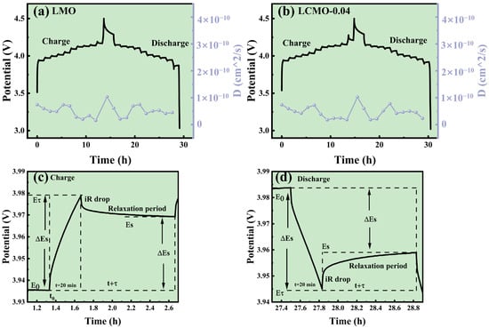 (a,b) GITT curves and plots showing the changes in lithium ion diffusion coefficients over time for LMO and LCMO-0.04, respectively. (c,d) The single titration curves for the LMO electrode during charge and discharge.