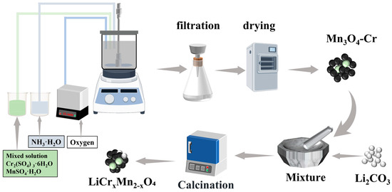 A series of LiCrxMn2−xO4 (x = 0, 0.02, 0.04, 0.06) samples were synthesized via a co-precipitation–calcination method. Initially, the appropriate amounts of MnSO4·H2O and Cr2(SO4)3·6H2O were weighed according to the stoichiometric ratio of Mn to Cr (Mn:Cr = 2−x:x). These compounds were dissolved in deionized water and thoroughly mixed to form a homogeneous solution. In a reaction vessel, deionized water was introduced and stirring commenced. When the temperature reached 50 °C, the Mn-Cr mixed solution, NH3·H2O, and oxygen were simultaneously pumped into the reactor. The reaction proceeded for 10 h. The resulting precipitates were naturally dried to yield precursor Mn3O4 containing varying Cr doping levels. Subsequently, the precursors were thoroughly ground and mixed with Li2CO3. Calcination at 800 °C yielded a series of LiCrxMn2−xO4, labeled as LMO and LCMO-x (x = 0.02, 0.04, 0.06), respectively. The synthesis flowchart is shown in Figure 9.