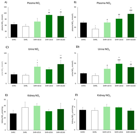 Total (A) nitrate/nitrite (NOx) and (B) nitrite (NO2) concentrations in plasma of SHR; total (C) nitrate/nitrite (NOx) and (D) nitrite (NO2) concentrations in urine of SHR; total (E) nitrate/nitrite (NOx); and (F) nitrite (NO2) concentrations in the kidney of SHR. SHRC received 0.5 mL/day of water, SHR+L received 10 mg/kg/day of losartan, SHR+UE10, SHR+UE50, and SHR+UE200 received 10, 50, and 200 mg/kg/day of Urtica dioica L. leaf extract (UE), respectively. * p < 0.05 and ** p < 0.01 compared to SHRC, # p < 0.05, ## p < 0.01, and ### p < 0.001 compared to SHRL. Data presented as mean ± SEM (one-way ANOVA omnibus test with Fisher least significant difference (LSD) post hoc test, Statistica version 8.0., StatSoft Inc., Tulsa, OK, USA).
