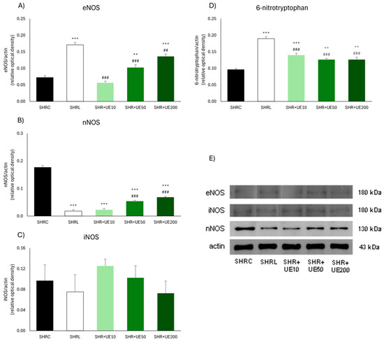 Kidney (A) eNOS, (B) nNOS, (C) iNOS, and (D) 6-NO2Trp protein expressions in SHR with (E) the representative Western blots of NOS isoforms. SHRC received 0.5 mL/day of water, SHR+L received 10 mg/kg/day of losartan, SHR+UE10, SHR+UE50, and SHR+UE200 received 10, 50, and 200 mg/kg/day of Urtica dioica L. leaf extract (UE), respectively, ** p < 0.01 and *** p < 0.001 compared to SHRC, ## p < 0.01 and ### p < 0.001 compared to SHRL. Data presented as mean ± SEM from three independent experiments (one-way ANOVA omnibus test with Fisher least significant difference (LSD) post hoc test, Statistica version 8.0., StatSoft Inc., Tulsa, OK, USA).