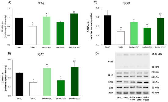 Kidney (A) Nrf-2, (B) CAT, and (C) SOD expressions in SHR with (D) representative Western blots. SHRC received 0.5 mL/day of water, SHR+L received 10 mg/kg/day of losartan, SHR+UE10, SHR+UE50, and SHR+UE200 received 10, 50, and 200 mg/kg/day of Urtica dioica L. leaf extract (UE), respectively. * p < 0.05 and ** p < 0.01 compared to SHRC, # p < 0.05 and ## p < 0.01 compared to SHRL. Data presented as mean ± SEM from three independent experiments (one-way ANOVA omnibus test with Fisher least significant difference (LSD) post hoc test, Statistica version 8.0., StatSoft Inc., Tulsa, OK, USA).