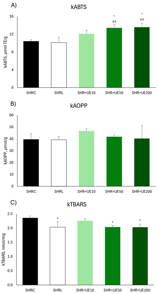 (A) antioxidant capacity (kABTS), (B) advanced oxidation protein products (kAOPP), and (C) lipid peroxidation level (kTBARS) in the kidney of SHR. SHRC received 0.5 mL/day of water, SHR+L received 10 mg/kg/day of losartan, SHR+UE10, SHR+UE50, and SHR+UE200 received 10, 50, and 200 mg/kg/day of Urtica dioica L. leaf extract (UE), respectively. * p < 0.05 compared to SHRC, ## p < 0.01 compared to SHRL. Data presented as mean ± SEM (One-way ANOVA omnibus test with Fisher least significant difference (LSD) post hoc test, Statistica version 8.0., StatSoft Inc., Tulsa, OK, USA).