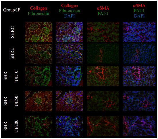 Collagen, fibronectin, α-SMA, and PAI-1 expression in kidneys of all investigated groups (magnification, ×200; α-SMA and PAI-1 of SHRL—magnification, ×100). The SHRC group exhibited slight collagen expressions within the kidney interstitium and mild expression within glomeruli, mostly localized in Bowman’s capsule. The expression of fibronectin was widespread in the interstitial compartment and within the glomeruli. The SHRL group exhibited decreased collagen and fibronectin expression within the kidney interstitium and within glomeruli. SHR+UE10 dose did not significantly reduce fibronectin expression, but collagen was prominently decreased. SHR+UE 50 dose significantly reduced fibronectin and collagen expression in the kidney interstitium, but with slightly preserved collagen expression in Bowman’s capsule. SHR+UE 200 dose completely reduced collagen expression in kidney structures, but without alteration in the expression of fibronectin compared to control and UE10 groups. SHRC and all investigated SHR+UE groups showed slight focal α-SMA expression within the interstitium, along with the normal expression in blood vessels, and also had focal interstitial PAI-1 staining. The SHRL group showed normal α-SMA expression localized to the area of blood vessels, with a reduced PAI-1 immunofluorescent staining. The SHR+UE10 group did not influence the α-SMA expression and PAI-1 expression, while SHR+UE50 and SHR+UE200 reduced expression of both molecules resembling the SHRL group. Nuclei were identified by 4,6-diamino-2-phenylindolyl-dihydrochloride (DAPI). SHRC—the control group, SHRL group—the SHR received losartan 10 mg/kg/day for 4 weeks; SHR+UE10, SHR+UE50, and SHR+UE200 groups—the SHR received 10, 50, and 200 mg/kg/day of UE for 4 weeks.