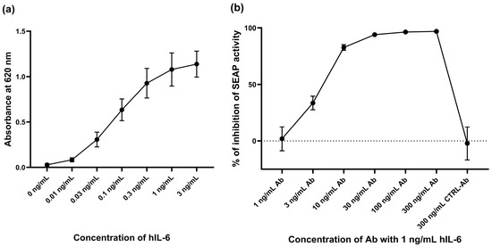To determine the effective concentration of hIL-6, we used the standard assay described in the protocol of the supplier of the HEK-Blue™ IL-6 Cells: 5 × 105 cells per well were seeded in a 96-well plate and directly treated with hIL-6 at a concentration ranging from 0.01 to 3 ng/mL. We determined the activity of SEAP in the culture medium by using a QUANTI-BlueTM solution (Invitrogen, Carlsbad, CA, USA) with the subsequent evaluation of colorimetric change being measured by using the SYNERGY H4 Microplate Reader spectrophotometer (BioTek, Winooski, VT, USA). Anti-hIL-6-IgG antibody mabg-hil6-3 (Invitrogen, Carlsbad, CA, USA) and a control mouse monoclonal antibody (Invitrogen, USA) were used to determine the specificity of the reaction.