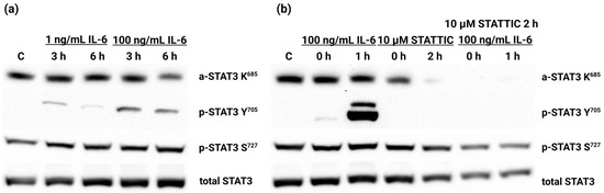 Although the phosphorylation of Y705 is the only post-translational modification of STAT3 that appears to be stimulated by a 3-h or 6-h treatment of the HEK-Blue™ IL-6 cell line by hIL-6, we decided to use the bioactive molecule Stattic (Tocris Bioscience, Bristol, UK), which inhibits STAT3 activation, dimerization, and nuclear localization [49]. Cells pretreated with Stattic (10 µmol/L for 1 h) and subsequently treated with hIL-6 (100 ng/mL for 1 h) showed a response to the presence of hIL-6 by the phosphorylation of Y705, independently of the phosphorylation of S727. Y705 phosphorylation was not detectable after the exposure of cells to the Stattic inhibitor. The acetylation of K685 was also affected (Figure 3b).