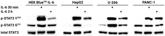 Treatment of HEK-Blue™ IL-6, HepG2, U-266, and PANC-1 cell lines with 50 ng/mL hIL-6 for 30 min or 3 h triggered STAT3 phosphorylation at Y705. In the case of HepG2 and U-266, S727 was also phosphorylated after IL-6 administration, mostly after a shorter incubation with hIL-6. Furthermore, we observed stable STAT3 phosphorylation at S727 in HEK BlueTM IL-6 and PANC-1 cell lines, which was also present under control conditions.
