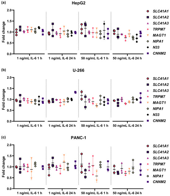 Relative expression ratios of eight analyzed magnesiotropic genes normalized to the expression rate of three reference genes (ACTB, GAPDH, YWHAZ). Cells were treated with hIL-6 at a concentration of 1 or 50 ng/mL for 1 or 24 h. Experiments were carried out with three cell lines, namely HepG2 (a), U-266 (b), and PANC-1 (c), in three independent replicates. The means, excluding outliers, are presented together with the standard deviation.