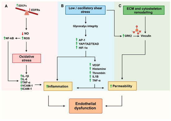 Mechanisms of endothelial dysfunction. (A) Oxidative stress: An imbalance between endothelium-derived constricting factors (EDCFs) and relaxing factors (EDFRs) results in reduced nitric oxide (NO) levels and increased reactive oxygen species (ROS). This activates NF-κB, promoting the expression of pro-inflammatory mediators such as IL-1β, IL-6, TNF-α, VCAM-1, and ICAM-1. (B) Low or oscillatory shear stress: Disruption of glycocalyx integrity activates the transcriptional regulators AP-1, YAP/TAZ/TEAD, and HIF-1α. This promotes the release of inflammatory mediators such as VEGF, histamine, thrombin, IL-1B, and TNF-α, driving inflammation and increasing endothelial permeability. (C) ECM and cytoskeletal remodeling: Alterations in ECM and cytoskeletal dynamics, mediated by GRK2 and vinculin, exacerbate vascular permeability. These structural changes further amplify the endothelial barrier dysfunction. Together, these processes culminate in inflammation, increased permeability, and ultimately, ED. ECM: extracellular matrix; eNOS: endothelial nitric oxide synthase; NO: nitric oxide; AP-1: activating protein 1; YAP: Yes1-associated transcriptional regulator; TAZ: Tafazzin; TEAD: TEA domain transcription factor 1; HIF-1α: hypoxia-inducible factor 1 subunit alpha; VEGF: vascular endothelial growth factor; IL-1B: interleukin beta1; TNF-α: tumor necrosis factor alpha; GRK2: G protein-coupled receptor kinase 2; and NF-Kb: nuclear factor kappa-light-chain-enhancer of activated B cells.