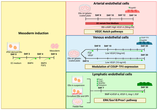 Differentiation of iPSCs into endothelial cell subtypes. Differentiation protocols for deriving arterial, venous, and lymphatic ECs from iPSCs. Mesoderm induction (yellow panel): iPSC-derived EBs are cultured in EC medium and treated sequentially with BMP4 (days 2–4) and a combination of BMP4 and FGF2 (days 4–6) to induce mesoderm specification. Arterial ECs (red panel): EBs, after mesoderm specification, are plated on gelatin-coated plates and treated with EC serum-free medium supplemented with 8Br-cAMP and a high level of VEGF-A (50 ng/mL). Activation of VEGF and Notch signaling pathways promotes arterial differentiation, marked by EphB2 expression, by day 14. Venous ECs (blue panel): After mesoderm specification, EBs are cultured with FGF and VEGF (days 6–8), followed by low VEGF (10 ng/mL) from day 10 onward. Modulation of COUP-TFII expression drives venous differentiation, as indicated by COUP-TFII and EphB4 expression. Lymphatic ECs (green panel): After mesoderm specification, EBs are cultured in suspension, co-cultured with OP9 stromal cells, or cultured in feeder-free conditions. The addition of BMP-4, VEGF-A, VEGF-C, angiopoietin-1 (Ang-1), and EGF activates the ERK/Sox18/Prox1 pathways, driving lymphatic differentiation. Key markers, including Prox1, Lyve1, VEGFR3, and Podoplanin, are upregulated by day 7, with mature lymphatic cells obtained by day 30. BMP4: bone morphogenetic protein 4; FGF2: fibroblast growth factor 2; cAMP: 8-bromoadenosine 3′,5′-cyclic adenosine monophosphate; VEGF: vascular endothelial growth factor; COUP-TFII: Chicken ovalbumin upstream promoter-transcription factor II; EphB2: Ephrin type-B receptor 2; EphB4: Ephrin receptor B4; Lyve1: lymphatic vessel endothelial hyaluronan receptor 1; Prox1: Prospero homeobox 1; VEGFR3: vascular endothelial growth factor receptor 3; ERK: extracellular signal-regulated kinase; and Sox18: SRY-Box transcription factor 18.