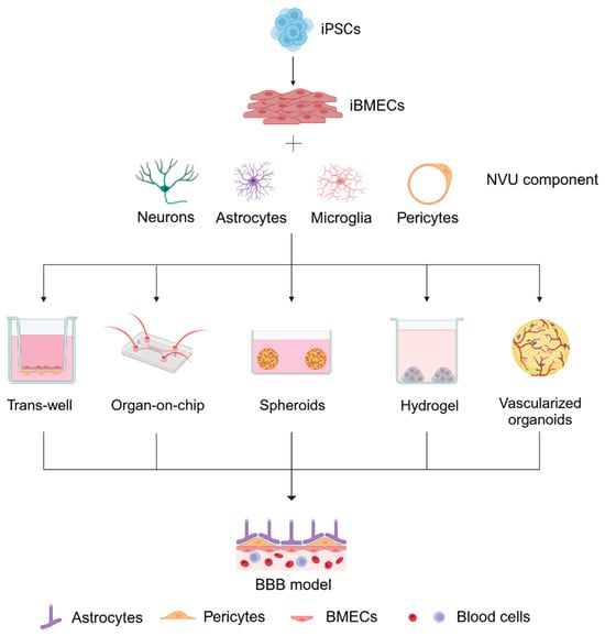 Modeling the blood–brain barrier (BBB) with iPSC-derived brain microvascular endothelial cells (iBMECs). Induced pluripotent stem cells (iPSCs) are differentiated into brain microvascular endothelial cells (iBMECs) and combined with key components of the neurovascular unit (NVU), including neurons, astrocytes, microglia, and pericytes. These cellular elements are assembled in several BBB models, including transwell systems, organ-on-chip platforms, spheroids, hydrogel-based cultures, and vascularized organoids, to mimic the structure and function of the human BBB. Each model offers unique advantages for studying the interactions within the NVU and assessing BBB integrity, permeability, and response to external factors.