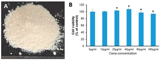 Nanoceria (CeO2 nanoparticles) was purchased from (Cerium (IV) oxide, <25 nm, product number: 544841; Sigma-Aldrich, St. Louis, MO, USA). In 96-well plates, cells were seeded at a concentration of 5000 per well. Cells were exposed to nanoceria at concentrations of 10, 20, 40, 80, and 160 µg/mL after 24 h. Following a 24 h exposure period to nanoceria, the cell viability analysis was conducted as described earlier. Using a microplate reader, absorbance at 450nm was determined following a 2 h incubation period with the CCK-8 reagent at 37 °C.