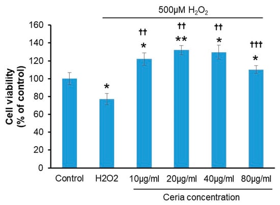 Ceria’s impact on oxidative stress induced by H2O2 in HT22 Cells. * p < 0.05 and ** p < 0.01 compared to the control group; †† p < 0.01, and ††† p < 0.001 compared to the H2O2-treated group (n = 3).