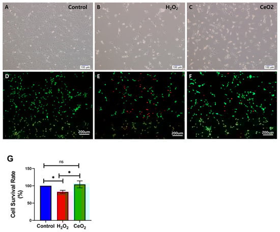 The effect of nanoceria on the viability of HT22 cells after H2O2 treatment was assessed through live/dead cell staining analysis. (A–C) Phase contrast micrograph images; (D–F) fluorescent imaging of live/dead cell staining. (A,D) Control group; (B,E) H2O2-treated group; (C,F) nanoceria-treated group. (G) Quantitative evaluation of HT22 cell viability using the ImageJ 1.52P software. Statistical significance was determined with * when p < 0.05, while results were considered not significant (ns) if p ≥ 0.05, based on a sample size of n = 3.