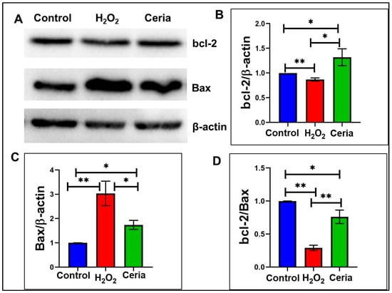The impact of nanoceria on the expression of proteins related to apoptosis in HT22 cells under oxidative stress caused by H2O2. (A) Immunoblots for bcl-2 and Bax; (B) expression levels of bcl-2. (C) bax expression levels; and (D) bcl-2 to Bax ratio. Statistical significance was determined with * when p < 0.05, ** when p < 0.01 based on a sample size of n = 3.