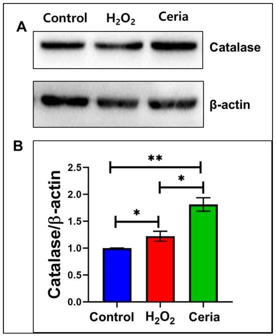 How nanoceria influences catalase levels in HT22 cells under oxidative stress induced by H2O2. (A) Immunoblot images for catalase; (B) quantified catalase expression levels. Statistical significance was determined with * when p < 0.05 and ** when p < 0.01 based on a sample size of n = 3.