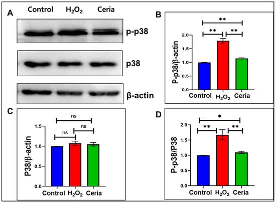 The effect of nanoceria on p-p38 and p38 MAPK expression in HT22 cells subjected to H2O2-induced oxidative stress. (A) Immunoblots for p-p38 and p38; (B) relative p-p38 expression; (C) relative p38 expression; and (D) p-p38 to p38 ratio. * p < 0.05, ** p < 0.01, and ns indicates not significant (n = 3).