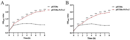 2.7. Cd Tolerance of the E. coli Cells Transferred pET28a-PeTrx2