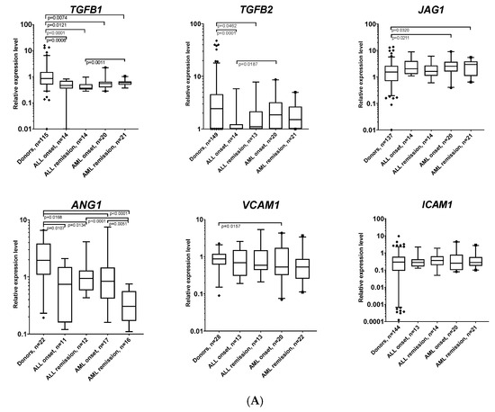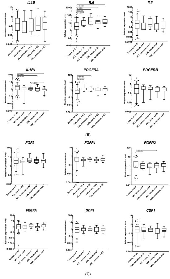 The relative expression levels of genes encoding factors important for the maintenance of hematopoietic stem cells were analyzed (Figure 2A). TGFB1 expression was significantly reduced in AL-MSCs at the onset and in remission compared to D-MSCs. TGFB2 expression was significantly reduced in ALL-MSCs at the onset and in remission compared to D-MSCs and AML-MSCs at the onset of the disease. JAG1 expression was significantly increased in AML-MSCs at the onset and in remission compared to D-MSCs. ANG1 expression was significantly reduced in AL-MSCs both at the onset and in remission compared to D-MSCs. In ALL-MSCs in remission, ANG1 expression increased compared with ALL onset, whereas in AML-MSCs, it decreased in remission compared with AML onset. VCAM1 expression was significantly reduced only in AML-MSCs at the onset. No changes were detected in the expression of ICAM1, IL1B, IL8, PDGFRB, FGF2, FGFR1, VEGFA, SDF1 and CSF1 (Figure 2A–C).
