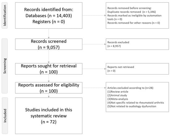Chicago/Turabian StyleChen, Jiann-Jy, Chih-Wei Hsu, Yen-Wen Chen, Tien-Yu Chen, Bing-Syuan Zeng, and Ping-Tao Tseng. 2024. "Audiological Features in Patients with Rheumatoid Arthritis: A Systematic Review" International Journal of Molecular Sciences 25, no. 24: 13290. https://doi.org/10.3390/ijms252413290