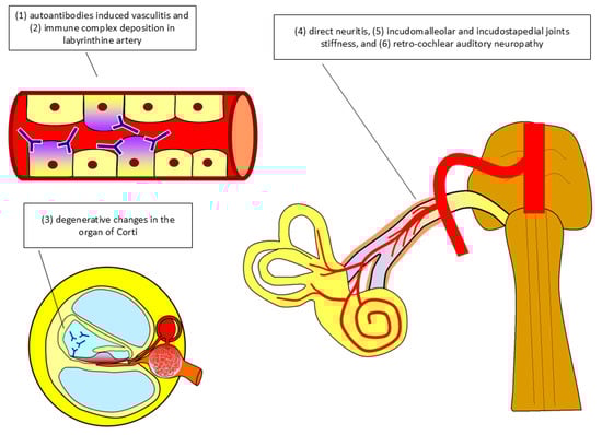- Tsirves, G.K.; Voulgari, P.V.; Pelechas, E.; Asimakopoulos, A.D.; Drosos, A.A. Cochlear involvement in patients with systemic autoimmune rheumatic diseases: A clinical and laboratory comparative study. Eur. Arch. Otorhinolaryngol. 2019, 276, 2419–2426. [Google Scholar] [CrossRef]