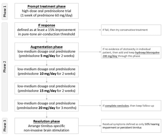 - McClelland, L.; Powell, R.J.; Birchall, J. Role of ciclosporin in steroid-responsive sudden sensorineural hearing loss. Acta Otolaryngol. 2005, 125, 1356–1360. [Google Scholar] [CrossRef] [PubMed]