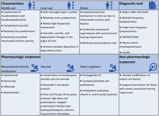 - Halligan, C.S.; Bauch, C.D.; Brey, R.H.; Achenbach, S.J.; Bamlet, W.R.; McDonald, T.J.; Matteson, E.L. Hearing loss in rheumatoid arthritis. Laryngoscope 2006, 116, 2044–2049. [Google Scholar] [CrossRef]
