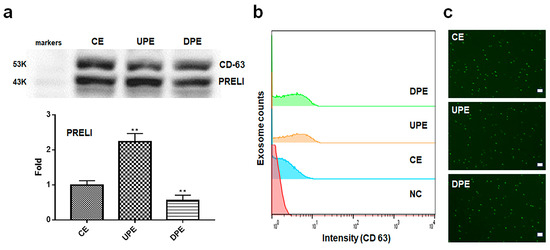 Purification of exosomes isolated from PRELI-modulated LCSCs. (a) Marker detection (CD63) and expression levels of PRELI in purified exosomes, as evaluated using Western blotting. Evaluation of purified exosomes with FITC-CD63 antibodies using flow cytometry (b) and fluorescence microscopy (c). CE: control cellular exosome, UPE: upregulated PRELI cellular exosome, DPE: downregulated PRELI cellular exosome, NC: unstained exosome (** p < 0.01), scale bar = 20 µm.