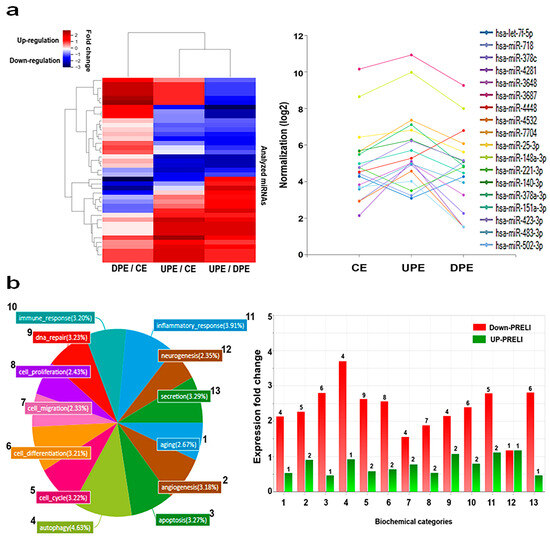 Profiling of exosomes from PRELI-modulated LCSCs. (a) Analyzed miRNAs (heat map) and identification of significant miRNAs in the exosomes. (b) Comparison of miRNA levels among three types of exosomes. Biochemical categories of the pie chart (1. aging, 2. angiogenesis, 3. apoptosis, 4. autophagy, 5. cell cycle, 6. cell differentiation, 7. cell migration, 8. cell proliferation, 9. DNA repair, 10. immune response, 11. inflammatory response, 12. neurogeneration, 13. secretion) associated with significant miRNAs in the induced exosomes and alterations of miRNA levels in each of the functional categories. The numbers above bar graphs indicate the number of differentially expressed miRNAs. CE: control cellular exosome, UPE: upregulated PRELI cellular exosome, DPE: downregulated PRELI cellular exosome.