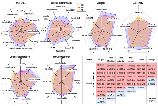 The miRNA profiling revealed that miRNAs in six out of all categories were significantly altered under the downregulated PRELI, identifying candidate miRNAs associated with the modulation of the PRELI (Figure 3). Notably, hsa-miR-378c showed the greatest difference between UPEs and DPEs, with a fold change value of 6 (Figure 3). Furthermore, this miRNA type was only associated with the cell cycle category (Figure 3). Additionally, hsa-miR-378a-3p, hsa-miR-25-3p, hsa-miR-423-3p, and hsa-miR-7f-5p in UPEs were associated with all categories (Figure 3).