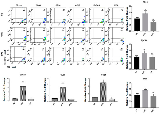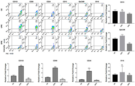 Notably, DPEs downregulated the remaining five markers, except for OV-6, in LCSCs, with pronounced reductions in CD133, CD90, CD24, CD13, and EpCAM levels (Figure 4). Interestingly, UPEs induced NHs to adopt characteristics of LCSCs (Figure 5). UPEs upregulated CD90, CD24, and CD133 significantly in NHs, with the most substantial increase noted for CD24 (Figure 5). Additionally, UPEs upregulated the remaining markers in NHs, except for EpCAM (Figure 5). Although DPEs suppressed the expression of CD133, CD90, and CD24 in NHs, the effects were relatively weak (Figure 5).