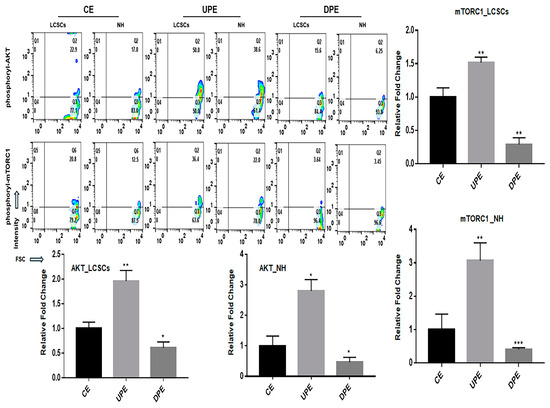 UPEs activated the AKT signaling pathway, a central pathway in LCSCs that regulates survival, therapeutic resistance, metastasis, and metabolic reprogramming in both LCSCs and NHs. In contrast, DPEs suppressed the AKT signaling pathway (Figure 6). The effects of UPEs on AKT signaling were greater in NHs than in LCSCs. Likewise, DPEs exerted a more pronounced suppressive effect on AKT signaling in NHs (Figure 6). Notably, although DPEs suppressed AKT signaling to approximately 0.32 times the maximum level, UPEs activated AKT signaling to approximately 3.1 times that in NHs.