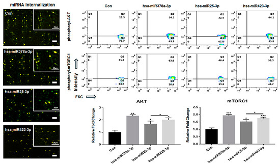 Expression of AKT signaling molecules in LCSCs under miRNA treatment. The merged images show the internalized fluorescence-labeled GAPDH-siRNAs (GFP: green fluorescent proteins) and miRNA (Cy5: cyanine 5) in LCSCs. The expression levels of AKT signaling molecules (phosphorylated AKT and phosphorylated mTORC1) in LCSCs transfected with the fluorescent (Cy5)-labeled miRNAs including hsa-miR378a-3p, hsa-miR25-3p, and hsa-miR423-3p and positive control siRNAs (GFP-GAPDH -siRNA) (* p < 0.05, ** p < 0.01, *** p < 0.001) (scale bars = 20 μm).