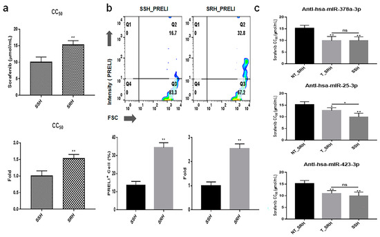 Attenuation of drug resistance and cellular viability in SRHs upon inhibition of three miRNAs. (a) Results from modeling drug resistance. (b) Expression levels of PRELI in SSHs (sorafenib-sensitive hepatocytes) and SRH (sorafenib-resistant hepatocytes). (c) Drug resistance in cells transfected with anti-miRNA siRNAs. Fill-patterned bar graphs indicate sensitivity for Sorafenib.CC50: cytotoxic concentration 50; NT: non-transfected; T: transfected, Ns: not significant (* p < 0.05, ** p < 0.01).