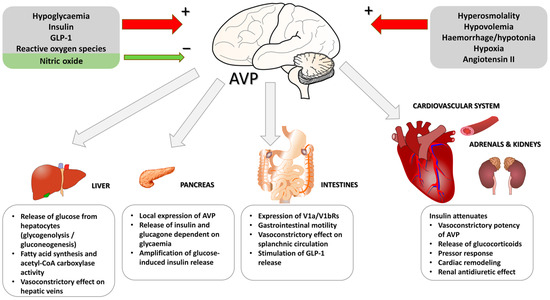 In summary, frequent coincidence of cardiovascular and metabolic diseases suggests similar molecular backgrounds of these disorders. Several studies indicate that vasopressin cooperates with insulin in several planes and may play the role of a link in the development of hypertension and diabetes mellitus. In this review, we summarize evidence that direct and indirect metabolic effects of vasopressin engage both V1a and V1b receptors and that AVP exerts its actions in the brain, cardiovascular system, liver, adipose tissue, autonomic nervous system, kidney, and pancreas (Figure 1 and Figure 2). The interactions between AVP and insulin are significantly affected in hypertension, cardiac failure, obesity, insulin deficiency, and insulin resistance.