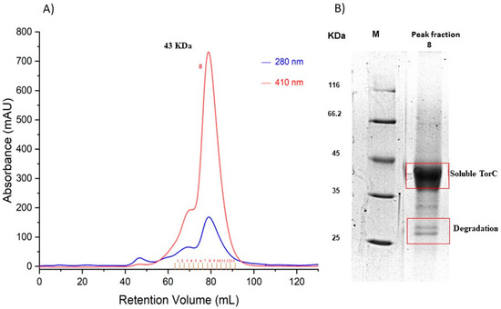 Purification of soluble TorC using gel filtration chromatography. (A) shows the gel filtration profile on a 16/600 Superdex 200 prep-grade column equilibrated in 50 mM Tris- HCl, pH 7.6 of the Ni-NTA-purified TorC (loaded approx. 20 mg) recorded at 280 nm (blue) and 410 nm (red). The peak eluting at 410 nm represents the absorbance of the heme-containing TorC. Fraction numbers are indicated at the respective volumes in red. (B) shows the 12% SDS-PAGE analysis of the main peak—No. 8—after gel filtration chromatography (elution volume 80 mL). M: molecular mass standard.