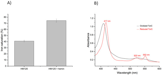 Characterization of purified soluble TorC. (A) ICP-OES analysis of purified soluble TorC showing the iron saturation of the protein, where 100% iron saturation corresponds to the presence of five hemes in the purified protein. (B) UV-Vis spectra of purified soluble TorC (10 µM) in the oxidized form (black line) and sodium dithionite (0.01 mM)-reduced form (red line) in 50 mM Tris-HCl pH 7.6.