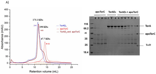 Analysis of TorAD2-apoTorC and apoTorA-TorC complex formation using gel filtration. Overlay of gel filtration profiles and SDS PAGE analysis of the fractions from the main complex peaks. The molecular masses of individual proteins and complexes formed were determined by an analytical Superdex 200 10/300 GL column. The concentrations used were 30 µM for each protein in 20 mM phosphate buffer, with pH 7.4. (A) apoTorC-TorAD2 and (B) apoTorA-TorC, together showing the complex elution peak (in brown).