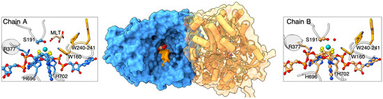 Crystal structure of TorA and active site composition. The center panel shows the two molecules in the asymmetric unit with chain A shown as a blue surface and chain B as a transparent gold surface, with a cartoon representation underneath. Chain A has a solvent-accessible active site and binds a malate molecule (shown as spheres with a cream color for carbon and red for oxygen) from the crystallization solution. The orange surface indicates the positions of three tryptophan residues (W160, W240, and W241) lining the active site pocket. The left and right panels show the active sites for chains A and B, respectively, with the bis-MGD cofactor and coordinating serine 191 (S191) depicted as a ball-and-stick structure colored light blue (left panel) or gold (right panel) for carbon, red for oxygen, dark blue for nitrogen, orange for phosphor, and yellow for sulfur. Neighboring residues to the molybdenum anions (depicted as cyan spheres) are shown as sticks. The malate (MLT) bound to the active site in chain A (left panel) is shown as a stick with carbon in a cream color and oxygen in red. The distance between the carboxylate group and Mo is 3.5–3.9 Å. In chain B (right panel), the entrance to the active site is blocked by chain B, and we find a water molecule (red sphere) at 2.6 Å from Mo.