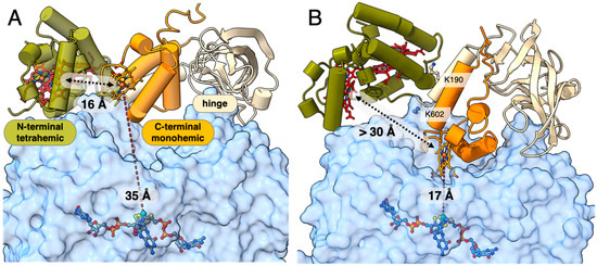 Models for electron transfer within the TorA-TorC complex. (A) Model generated by AlphaFold-multimer. TorC is shown as a cartoon with TorCN colored in olive, the hinge domain in cream, and TorCC in orange. The crystal structure model of TorA is shown as a transparent blue surface with the bis-MGD cofactor depicted as a ball-and-stick figure with the same color scheme as in Figure 5. Hemes are added to TorC by superposition with the TorC model generated by AlphaFold3 and are shown as ball-and-stick figures with the Fe ions colored in orange. The distance between TorCC-Heme (Fe ion) and Mo is 35 Å (dashed red line), and the distance to the nearest heme in TorCN is 16 Å (dashed black line). (B) Model generated by AlphaLink2. The predicted template modeling (pTM) score and the interface predicted template modeling (ipTM) score are, respectively, 0.85 and 0.83. The side chains from the validated crosslink between TorA:K602 and TorC:K190 are shown as ball-and-stick figures. The orientation of the complex is slightly different from panel A for better visualization of the shorter distance between TorCC-Heme (Fe ion) and Mo in TorA (17 Å, dashed red line). The distance between TorCC-Heme (Fe ion) and the nearest heme in TorCN is now >30 Å (dashed black line).