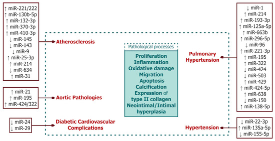 Alterations in the expressions of key known microRNAs during the development of specific cardiovascular pathologies (atherosclerosis, hypertension (arterial and pulmonary), and diabetic cardiovascular complications). ↑, overexpression; ↓, reduced expression.