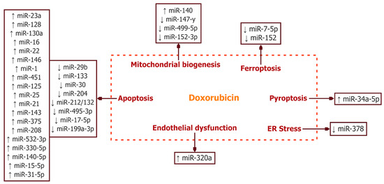 Effects of doxorubicin on microRNA expression in modulating apoptosis, mitochondrial biogenesis, ferroptosis, pyroptosis, endoplasmic reticulum (ER) stress, and endothelial dysfunction. ↑, overexpression; ↓, reduced expression.